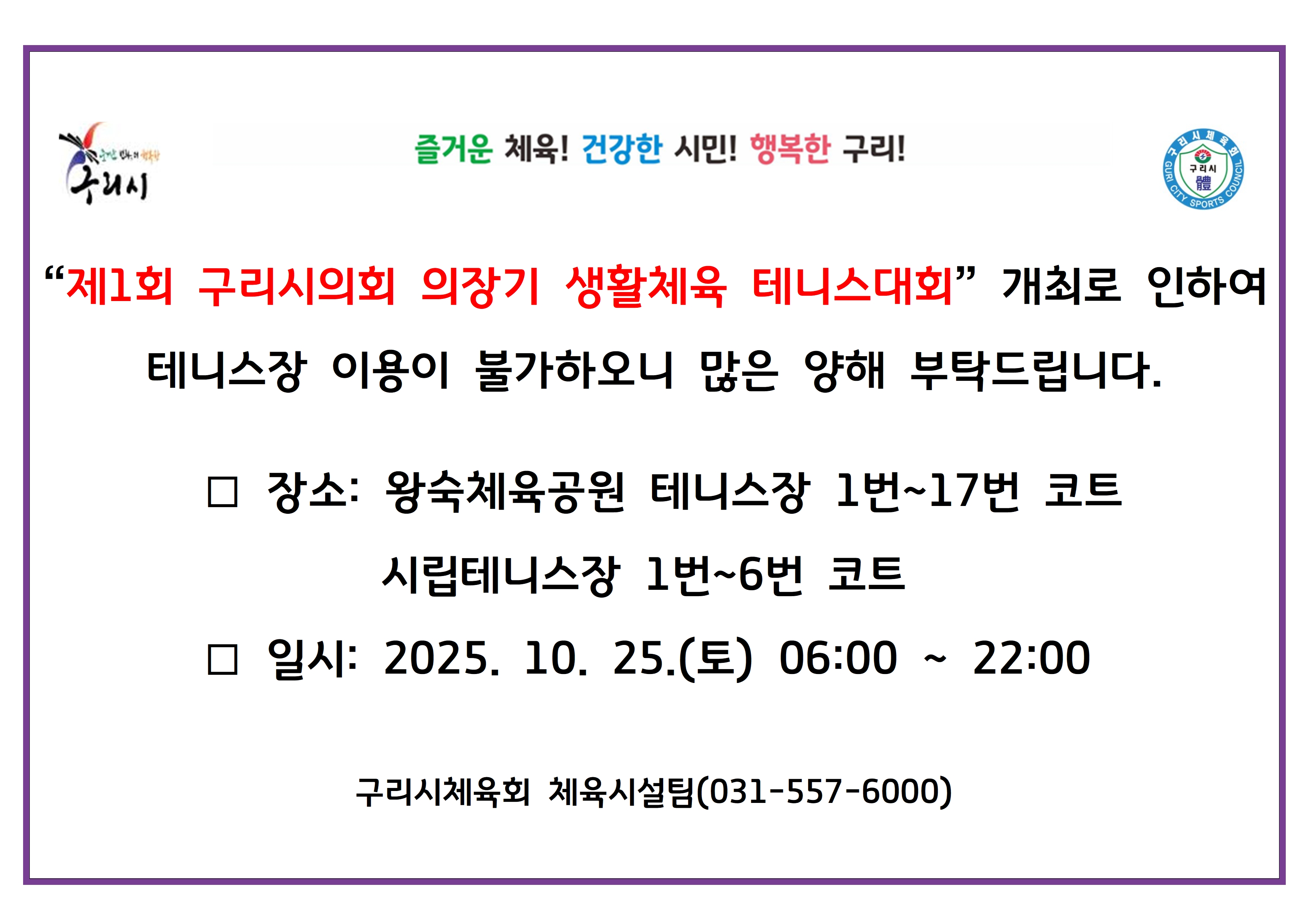 제1회 구리시의회 의장기 생활체육 테니스대회 개최로 인한 테니스장 이용 불가 안내