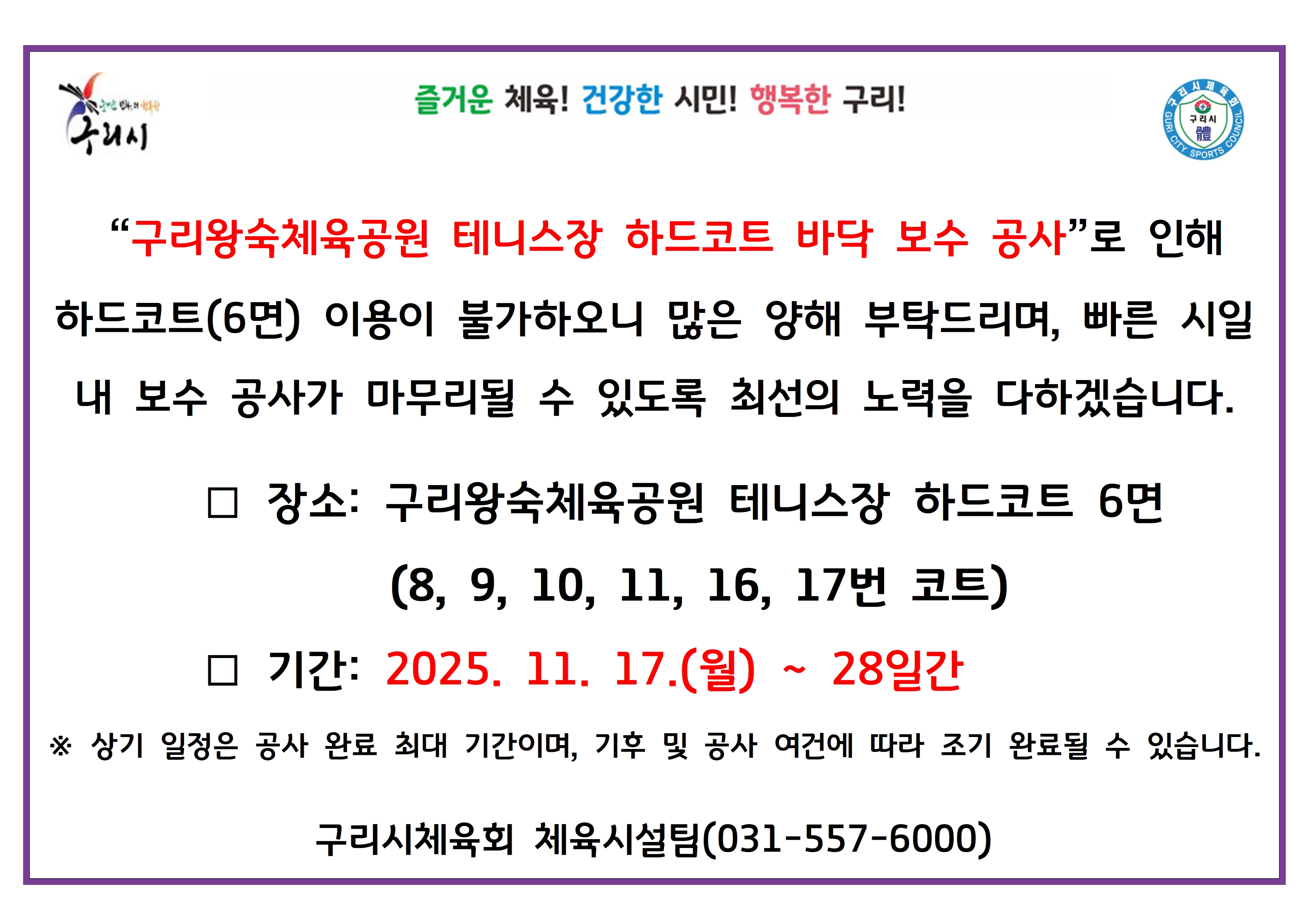 구리왕숙체육공원 테니스장 하드코트 바닥 보수 공사로 인한 이용 불가 안내
